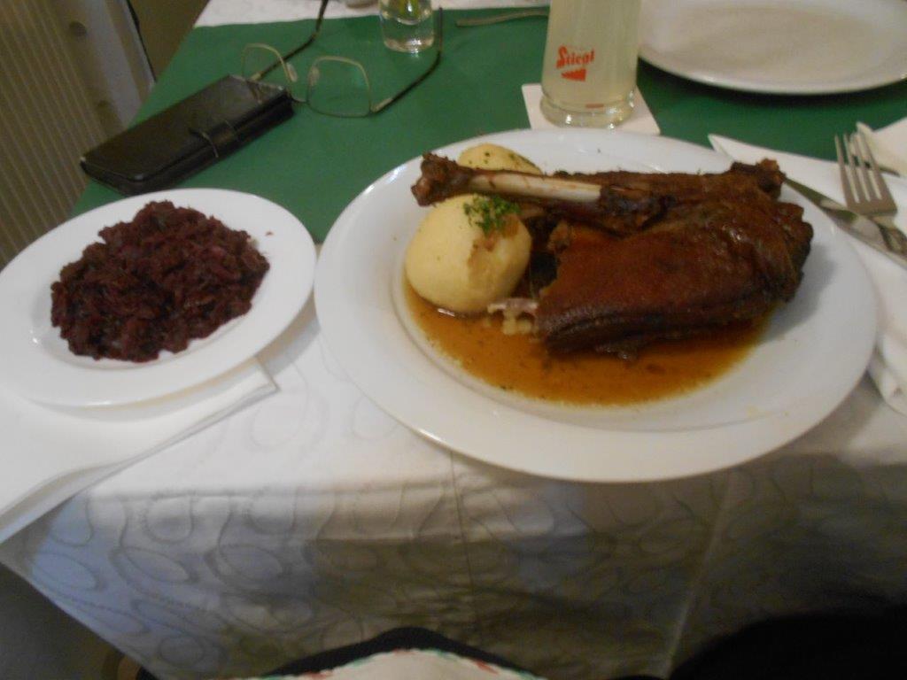 Als Hauptgang der Star des Menüs, der Gänsebraten. Serviert mit Rotkraut, wobei es bei dieser Beilage auch die Wahlmöglichkeit gab, statt dem Rotkraut Linsen zu ordern, und Erdäpfelknödel. Die Gans war butterweich und ist, wie man so schön sagt, von den Knochen gefallen, die Haut knusprig braun. Der Geschmack ein Traum, der Garpunkt sehr gut getroffen. Die Qualität nicht leicht zu toppen. Nicht umsonst der Star der Speisenfolge.