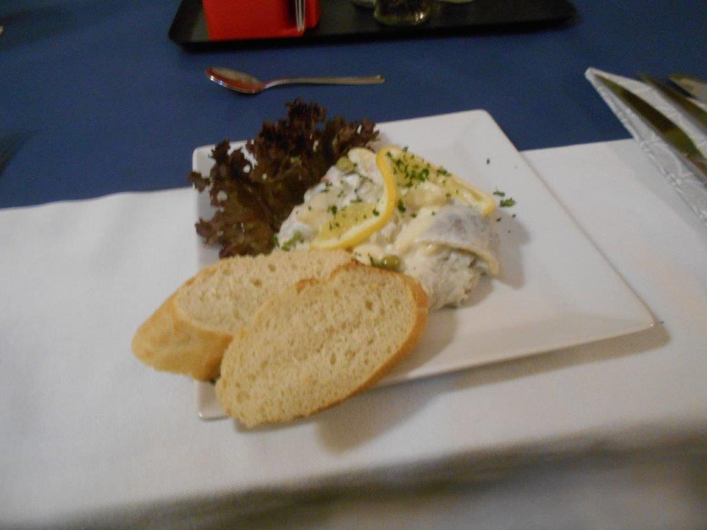 Als Einstieg wurde uns ein schmackhafter hausgemachter Heringssalat mit Baguettescheiben serviert. Dies ist ein Klassiker und darf beim Heringsschmaus natürlich nicht fehlen. Gut abgeschmeckt mit Apfelstückchen, grandios.