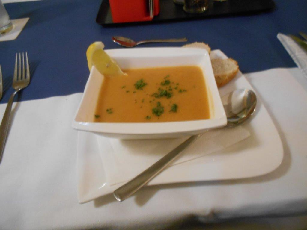 Die zweite Vorspeise, diesmal warm, war eine Garnelencremesuppe. Die Suppe war wunderbar cremig, mit reichlich Garnelen als Einlage. Der zweite Gang hat sehr gut geschmeckt.