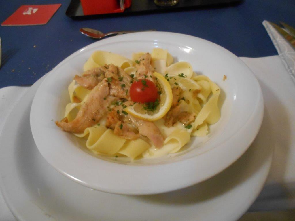 Danach wurde der erste Hauptgang serviert. Gegrillte Lachsstreifen auf Bandnudeln in Knoblauchsauce. Die Kombination hat was, der gegrillte Fisch zu den Bandnudeln mit der cremigen Knoblauchsauce ergeben ein absolut stimmiges Gericht.
