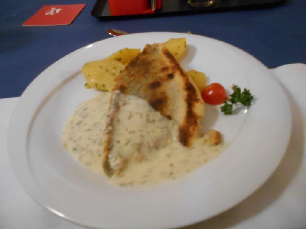 Die zweite Hauptspeise war ein in Butter gebratenes Filet von der Goldbrasse mit einer Zitronen-Dillsauce und Petersilienkartoffeln. Das zarte Filet der Goldbrasse harmonierte mit der Sauce sehr gut.