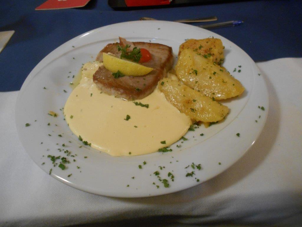 Dem noch nicht genug der Köstlichkeiten, wurde der dritter Hauptgang gebracht. Ein Thunfischsteak mit Sauce Hollandaise und Kartoffeln. Das Steak auf den Punkt gebraten, die Hollandaise cremig und die Kartoffel sehr gut, so variantenreich kann man Fisch zubereiten.