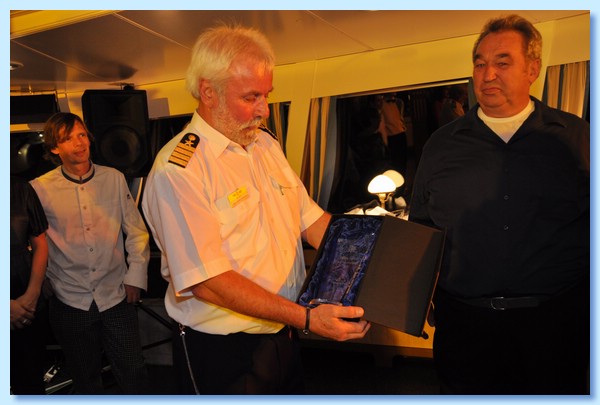 Herr Kapitän hatte ganz offensichtlich nicht damit gerechnet, umso schöner war, für alle auf dem Schiff, die ihm bereitete Überraschung. Auch der Freizeitclub Mücke ließ es sich nicht nehmen Herrn Kapitän König, der uns viele Male wunderschöne Abende ermöglicht hat, zu verabschieden und ihm ein Andenken an uns zu überreichen. Hiermit möchte ich allen, die an dieser Verabschiedung mitgewirkt und uns die Möglichkeit des Mitmachens ermöglicht haben noch einmal ganz herzlich Danke sagen.