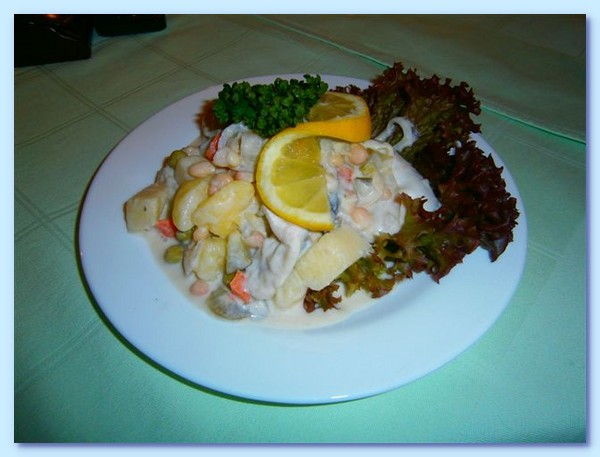 Danach eine warme Vorspeise, es wurden Miesmuscheln in Weißwein kredenzt. In den Bildern zum Heringsschmaus kann man nachsehen, es ist eine üppige Portion.