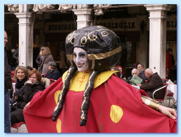 Auf unserem Weg weiter durch die Stadt konnten wir bald schon die ersten Masken bewundern. Wir wanderten durch schmale Gässchen, über wunderschöne Plätze, vorbei an Kirchen und Palästen. Auf dem Markusplatz begegneten uns viele der wunderschönen Masken, der prachtvollen Kostüme, manche blieben stehen damit die Schaulustigen Fotos machen konnten, andere eilten vorbei ohne anzuhalten. Die Lagunenstadt zeigte sich von ihrer schönen Seite und gegen Mittag blinzelte dann auch die Sonne hervor. Wir suchten uns in einem der Lokale am Meer nahe am Markusplatz ein Plätzchen um ein wenig zu rasten und um etwas zu trinken. Dann ging es wieder durch die schmalen Gassen durch die Stadt.