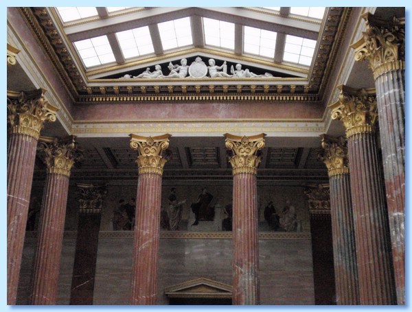 Zuerst erfuhren wir, dass das Gebäude vom Architekten Theophil Hansen geplant, gebaut und nach seinen Plänen auch nach seinem Tode noch fertiggestellt wurde. Nach kurzer Einführung stiegen wir über eine mit rotem Teppich bespannte Treppe stiegen zur Säulenhalle empor. Schon der Stiegenaufgang war beeindruckend, aber noch viel imposanter erschien die Säulenhalle Sie bildet den Mitteltrakt des Gebäudes, mit ihren 24 Marmorsäulen aus Adneter Marmor, sie wurden aus einem Stück gefertigt, sind rund 16 Tonnen schwer und bis auf zwei im Original vorhanden. Zwei Säulen wurden während des zweiten Weltkrieges zerstört. Sie sind durch Farbe und Glanz deutlich von den Originalen zu unterscheiden. Heute dient sie als Veranstaltungsort für Ausstellungen und Empfänge. Wunderschön sind auch die Reste eines Friesgemäldes von Eduard Lebiedzik, das die Entwicklung der Kultur mit besonderer Bezugnahme auf Österreich darstellt.