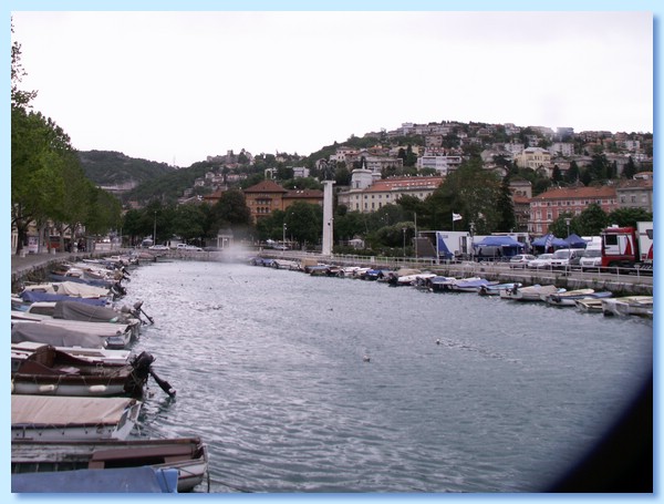 Schon sehr früh am Morgen, um 6.20 Uhr war Abfahrt von Ljubljana, neuerlich an einen Planzug angekoppelt, mit einem sogenannten breakfast in the box vom Hotel ausgestattet, fanden wir uns im NEEK-Waggon wieder ein. Der Wettergott war uns an diesem Morgen wirklich nicht gnädig, es war Schnürlregen angesagt, der Weg zum Bahnhof war eine eher feuchte Angelegenheit. Die Wolken hatten kein Einsehen und es regnete auch bei unserer Ankunft in Rijeka noch. Hier holte uns die Stadtführerin vom Zug ab und beleitete uns zum Vorplatz des Bahnhofes wo wir in Taxis stiegen, die uns zum Hotel Continental brachten. Dieses Gebäude, wie so viele andere auch, haben auch heute noch den Flair der vergangenen Zeit. Nach der Ankunft im Continental deponierten wir vorerst die Gepäcksstücke und traten mit Schirmen bewaffnet die Stadtführung an. Beim Marsch Richtung Altstadt konnten wir das Meer deutlich riechen.