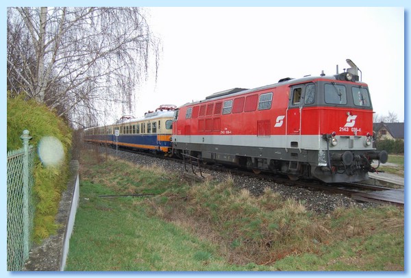 Danach ging es weiter in Richtung Heiligenstadt, anschließend über die Verbindungsbahn S 45, mit kurzen Fotohalten in Ottakring und Penzing über die Verbindungsspange nach Meidling und dann über die Pottendorferlinie zum Wiener Neustädter Hauptbahnhof. Vor der Weiterfahrt wurde in Wiener Neustadt der Oldtimer-Schnellbahngarnitur noch die Diesellok 2143 038-4 vorgespannt. Die Montage der Kupplung wurde von einigen Reisenden noch zur fotografischen Dokumentation genutzt, bevor es zum nächsten Etappenziel nach Brunn an der Schneebergbahn ging. Hier erwartete uns beim Heurigen „Alte Mühle“ ein köstliches Mittagsbuffet, das wir in gemütlicher Atmosphäre genießen konnten.