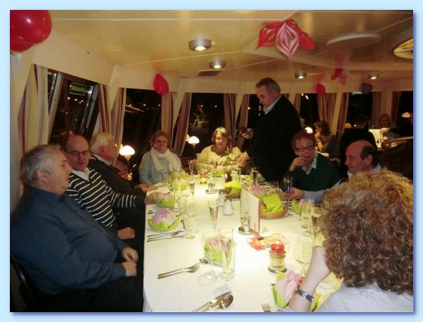 Wir hatten am Oberdeck ganz vorne den großen Tisch bekommen. An den Wänden waren roten Luftballons in Herzform befestigt und herzförmige Ornamente aus rotem Karton. Auf dem Tisch stand eine weiße Vase mit einer einzelne rote Rose. Die Gedecke waren schön hergerichtet und bekamen durch die Serviettenseerose einen romantisch festlichen Touch.