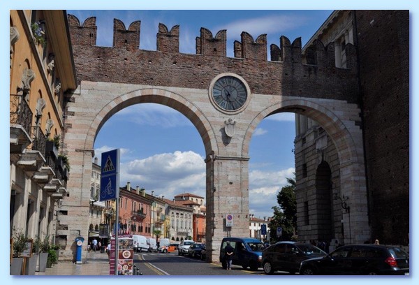 Vorerst verließen wir wieder die Innenstadt zwischen und den Resten der Stadtmauern, die heute begrünt sind und als Erholungsgelände dienen. Beim Bahnhof nahmen wir wieder Touristen auf und weiter ging’s zur nächsten Pforte, der Porto Nuova, dort einmal rund herum, damit wir auch die schöne Seite sehen konnten. In der Nähe des nächsten Tores bogen wir ab. Wir waren nun im Stadtteil von San Zeno. Hier gibt es eine Maske, die ein Verein im Stadttor aufbewahrt, Papà del Gnocco. Sie erinnert an den Mäzen, der während einer Hungersnot Mehl zur Verfügung stellte, um alle Einwohner des Viertels zu ernähren. Dann fuhren wir am mächtigen Castellvecchio, das heute als Museum genutzt wird vorbei, dem Gavi-Bogen und kamen zum Borsari Stadttor, wo einstens die Zöllner mit der Bursa, dem Geldbeutel, die Steuern für durchgehende Waren eintrieben. Jetzt überquerten wir die Etsch und fuhren auf der anderen Seite des Flusses, noch ein paar Kirchen passierend, den Berg hinauf. Was ebenfalls auf dieser Flussseite zu finden war, waren sehr schöne Wohnhäuser, die sich reiche Leute bauen ließen. Diese Häuser hatten Gärten und waren nicht so dicht gedrängt aneinander gebaut wie in der Altstadt. Oben auf dem Berg, unterhalb der Wallfahrtskirche Santuario NS Signora Di Lourdes, gab es einen Fotostopp, da es dort einen wunderbaren Blick über die Stadt Verona gibt. Vorbei am Römischen Theater ging es wieder zur Ausgangsstelle zur zurück. Bald darauf fuhren mit der anderen Linie durch die Stadt. Beim Dom stiegen wir aus, um diesen Kirchenkomplex näher zu betrachten. Leider wird er gerade renoviert. Aber es ist trotz dieser Einengung ein schönes Gotteshaus. Als wir herauskamen fing es an zu regnen, nein zu schütten. Fast eine Stunde mussten wir auf den nächsten Rundfahrtsbus warten. Dann war es Zeit, unser Hotelzimmer zu beziehen. Und dann der erste Opernabend.